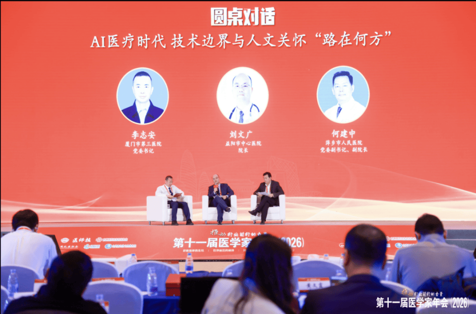 在厦门市第三医院党委书记李志安主持下,益阳市中心医院院长刘文广、无锡市人民医院院长顾晓峰、山东大学齐鲁第二医院副院长靳斌、萍乡市人民医院党委副书记、副院长何建中,多维度展开分享,技术应用层面,探讨AI技术在临床诊断、治疗以及护理等环节的应用,以及如何避免技术门槛带来的医疗风险;人文关怀层面,聚焦AI成为医疗服务重要载体时,如何守护患者沟通的温度,平衡技术便捷与患者情感需求;行业发展层面,深入分析医院管理者如何构建技术加人文的双轮驱动医疗体系。